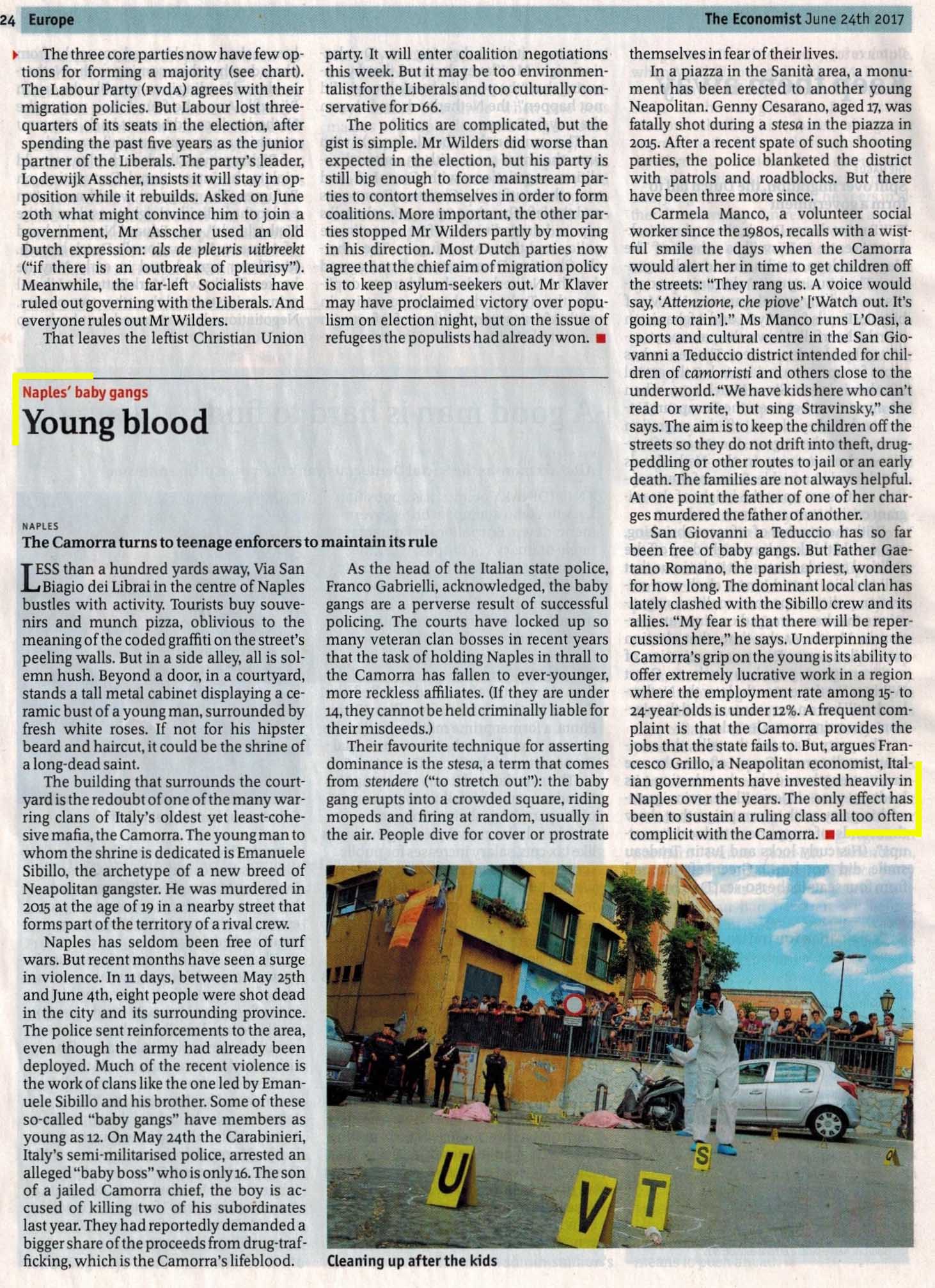 Naples has seldom been free of turf wars. But recent months have seen a surge in violence. In 11 days, between May 25th and June 4th, eight people were shot dead in the city and its surrounding province. The police sent reinforcements to the area, even though the army had already been deployed. Much of the recent violence is the work of clans like the one led by Emanuele Sibillo and his brother. Some of these so-called “baby gangs” have members as young as 12. On May 24th the Carabinieri, Italy’s semi-militarised police, arrested an alleged “baby boss” who is only 16. The son of a jailed Camorra chief, the boy is accused of killing two of his subordinates last year. They had reportedly demanded a bigger share of the proceeds from drug-trafficking, which is the Camorra’s lifeblood.