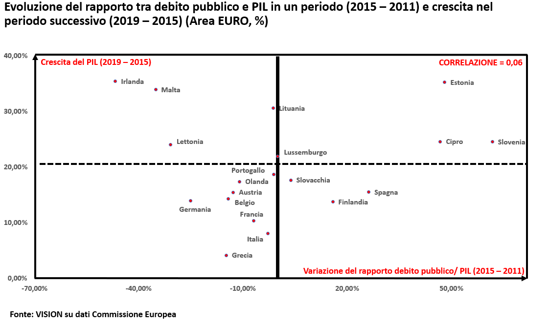 Forse, però, alla base di tutto c’è l’errore concettuale di affidarsi ad un’ipotesi non provata, sulla quale costruiamo leggi finanziarie e dibattiti surreali: l’idea che per crescere bisogna indebitarsi. Ed invece, l’evidenza statistica dice che si può crescere mentre si riduce il debito. Il grafico che accompagna questo articolo ed elaborato da Vision dice che, ad esempio, la correlazione tra Deficit e aumento del PIL è molto più bassa di quanto molti ritengono (e che metà degli Stati dell’euro zona sono riusciti a migliorare la sostenibilità del proprio bilancio pubblico più dell’Italia - nel 2011 – 2015, ottenendo risultati molto migliori anche sul piano della crescita nel periodo medio).