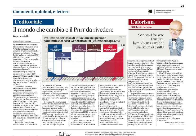 Non è, dunque, scandaloso immaginare di ripensare NextGenerationEU. Proprio perché quella decisione va difesa. A patto che sia un rafforzamento di livello europeo (e non di accordi tra Commissione e singolo Paese). Che si convincano gli altri Stati ricordando che è uno strumento che già costa ai contribuenti di tutti i Paesi e che a tutti può servire. L’Italia – come massimo beneficiario di NGEU – e il prossimo governo avrà l’occasione di presentare una proposta seria: potrebbe essere decisiva per rendere l’Europa meno “burocratica” e più politica; meno ideologica e più dotata del pragmatismo di cui ha bisogno per sopravvivere a crisi appena cominciate.