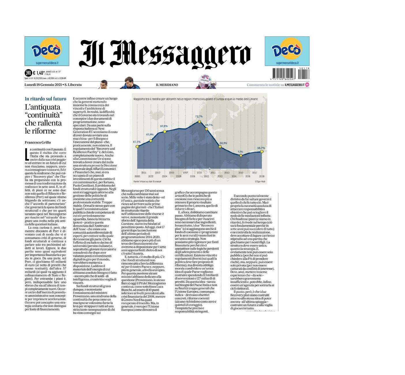La continuità con il passato. È questo il rischio che corre l’Italia che sta provando a uscire dalla sua crisi peggiore ed entrare in un futuro di cui non riusciamo, neppure, ancora a immaginare i contorni. Ed è questa la sindrome che può colpire i “Recovery Plan” che l’Italia sta preparando con la promessa di una trasformazione da realizzare in sette anni. E, in effetti, di Piano ce ne sono due: non solo quello di Rilancio e Resilienza (PNRR) sul quale stiamo litigando da settimane; c’è anche l’”accordo di partenariato” che governerà la spesa dei fondi strutturali e che per tre quarti saranno spesi nel Mezzogiorno per riuscire nel “miracolo” di segnare una svolta delle più antiche delle questioni italiane.