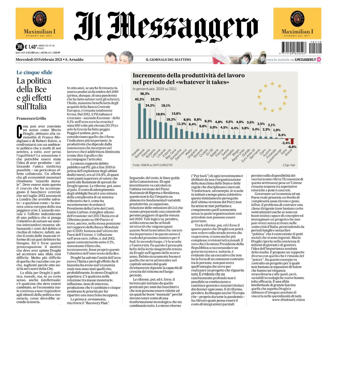 Tra le riforme, poi, ed è forse il quarto punto che Draghi non potrà non vedere sulla strada stretta che va percorsa, ci sono anche più complesse revisioni istituzionali. È vero che è lo stesso Presidente della Repubblica a raccomandare un governo tecnico e, tuttavia, è evidente che un esecutivo che non ha la forza di un consenso costruito tra le persone, non può avere quell’energia che servono per realizzare un progetto che riguarda tutti. È evidente che un cambiamento profondo non è possibile se continuiamo a cambiare governi e ministri titolari dei dossier ogni anno. E di riforme, peraltro, ha bisogno anche l’Europa che – proprio durante la pandemia – ha rilevato quale possa essere il costo di integrazioni parziali: persino sulla disponibilità dei vaccini (come rileva l’ECONOMIST di questa settimana) pesa un’Unione rimasta sospesa tra aspettative retoriche e poteri concreti.